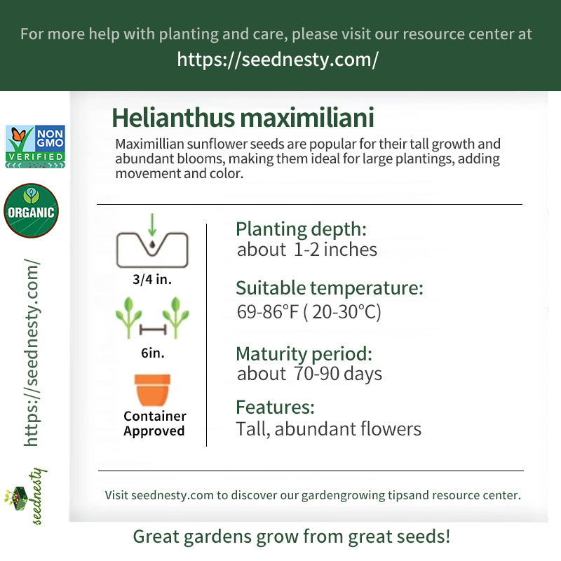 Maximilian sunflower seeds thrive in the sun, their tall flowers standing tall like giants, creating a truly stunning sight. Their abundant blooms and robust growth make them ideal for large plantings, adding a touch of movement and vitality to your garden. Imagine admiring these towering sunflowers in your garden, and you'll feel a surge of joy and satisfaction. Maximilian sunflowers are not only beautiful for viewing, but also attract birds and insects, adding life and vitality. Their presence fills your garden with color and vitality, making them an indispensable natural companion in your life.