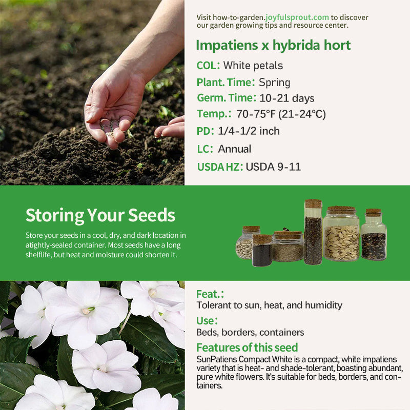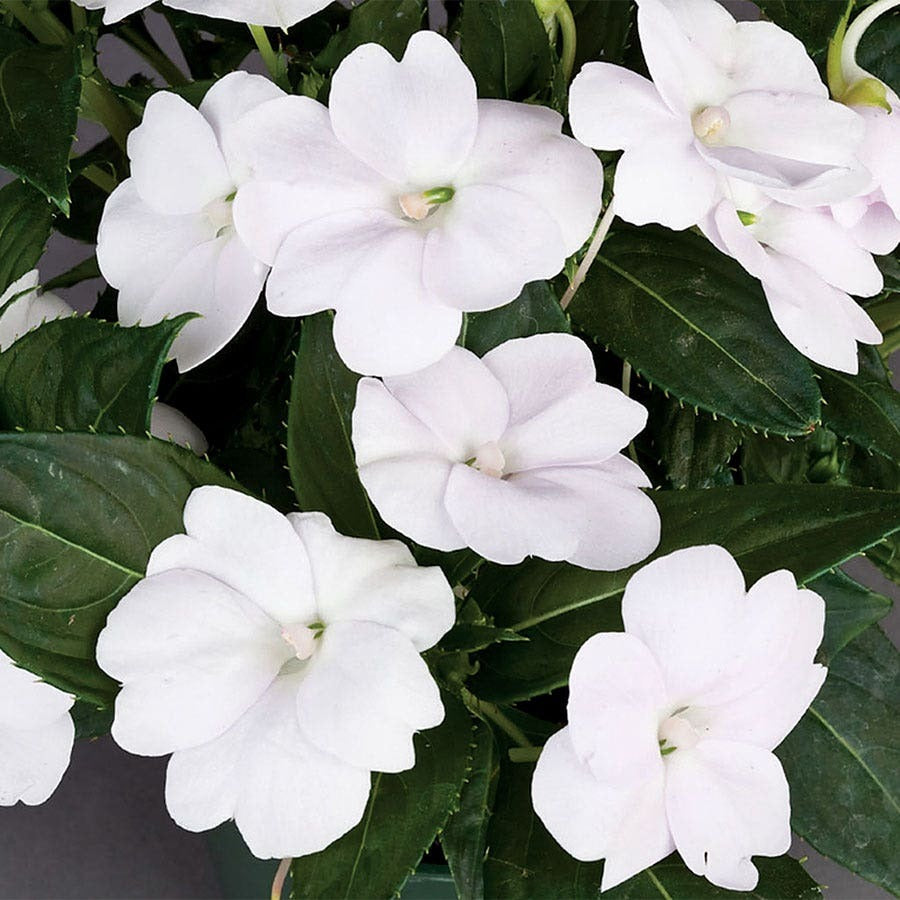 SunPatiens Compact White is a vigorous impatiens variety with excellent tolerance to sun, heat, and humidity, and is resistant to downy mildew. Its mound-shaped plant features dark green leaves and pure white flowers, blooming continuously from late spring to late autumn, a three-season blooming period. It is a moderately demanding plant, suited to moist, well-drained soil. It is suitable for beds, borders, containers, and as a groundcover.
