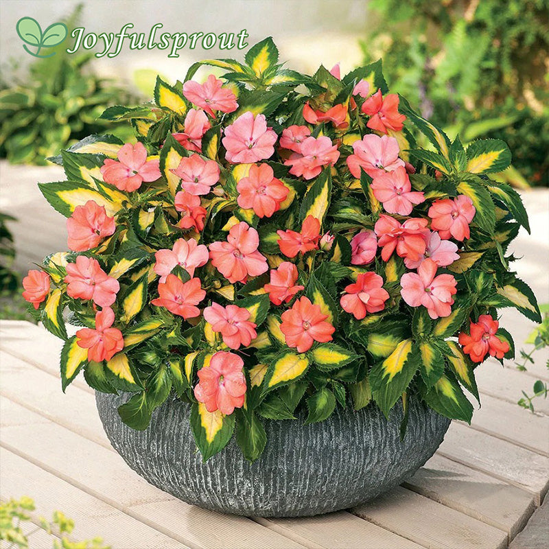 SunPatiens Vigorous Variegated Salmon is a vigorous plant that quickly reaches 2-4 feet in height and a width of up to 3 feet. Its distinctive leaves, gradating from bright yellow to lemon green and edged with deep forest green, create a vibrant display. Salmon-pink, heart-shaped petals cluster abundantly atop the leaves, and the flowers bloom profusely. It has a strong root system and is resistant to heat, humidity, heavy rain, and even short periods of drought. It is also resistant to downy mildew, a common disease affecting impatiens. It thrives in partial shade, dappled sun, and mixed-light conditions, making it suitable for flower beds, large containers, and as an excellent groundcover, adding long-lasting, vibrant color to the landscape.