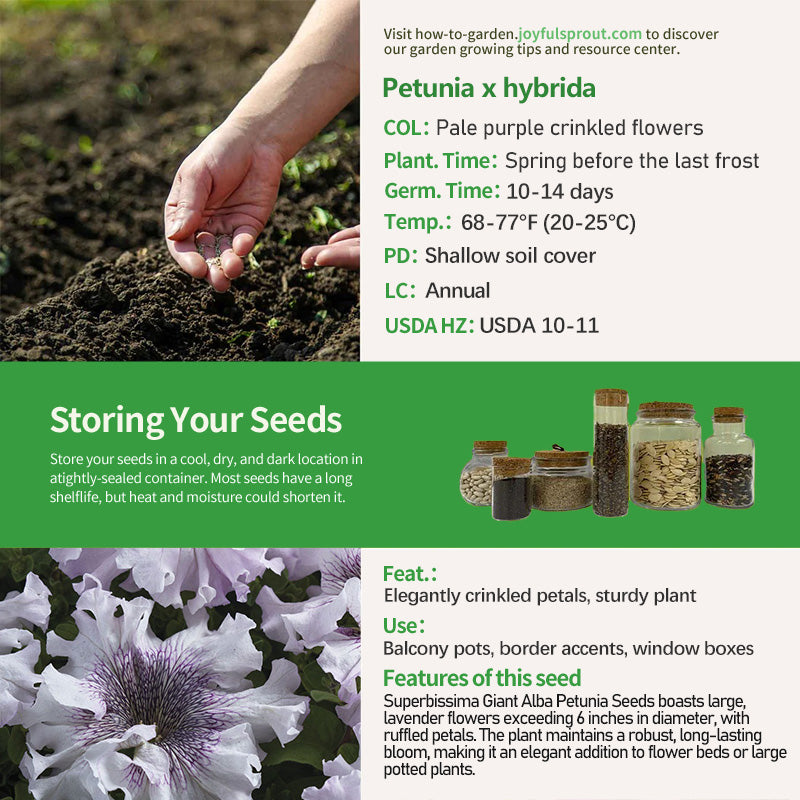 Superbissima Giant Alba Petunia Seeds is a classic lavender variety among "large-flowered" petunias. Its flowers, exceeding 6 inches in diameter, are more than twice the size of typical petunias. Its petals feature naturally ruffled edges, creating a peony-like elegance. Its blooms glow softly in the sun, creating a striking visual impact. The plant grows robustly, with sturdy stems providing strong support, easily supporting its large blooms without drooping or collapsing. The flowering period lasts from early summer to early autumn, with individual flowers remaining long-lasting. The plant is also sun-tolerant, and adequate shade in summer can prevent petal burn. This variety is suitable for use as a centerpiece in a flower bed, a centerpiece in a garden, or in a large planter.