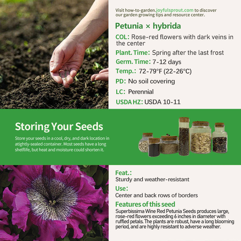 Plants grown from Superbissima Wine Red Petunia seeds exhibit large, showy flowers. The flowers often exceed 6 inches in diameter, and the petals are a rich, even rose-red color that shimmers captivatingly in the sun. The petals are delicately ruffled at the edges, resembling the hem of a gorgeous skirt, creating a delicate and elegant look. The plants are robust, with sturdy stems that support the large flowers and resist falling over. The leaves are dark green, oblong, and slightly hairy, adding a rustic touch to the plant. Blooming begins in mid-spring and continues until late autumn.