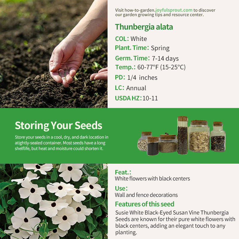 Susie White Black-Eyed Susan Vine Thunbergia Seeds are an elegant climber suitable for all gardening styles. After sowing these seeds, you'll see them grow rapidly in the sun, displaying pure white flowers with black centers. The blossoms sway gracefully in the breeze, adding a touch of elegance to your garden. Imagine planting these seeds on your balcony and anticipating their bloom. Over time, you'll see them climbing up walls, fences, or trellises, creating a beautiful display. Susie White Black-Eyed Susan Vine not only beautifies your surroundings but also brings you the joy of connecting with nature, becoming a beautiful addition to your garden.