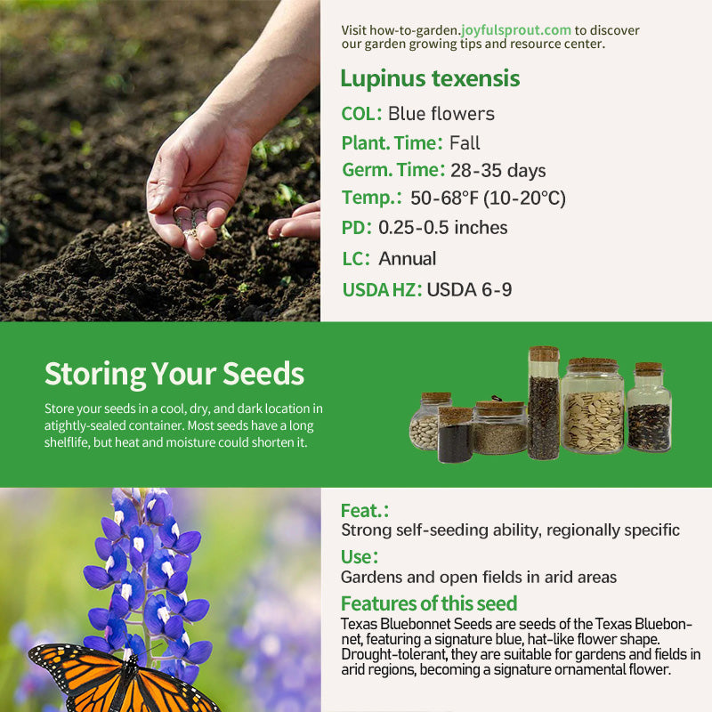 Texas Bluebonnet Seeds cultivates the state flower of Texas, known for its signature blue flowers, which resemble a cowboy hat and are instantly recognizable by their petals. Plants grown from these seeds are highly drought-tolerant and suitable for arid and semi-arid regions with low rainfall, requiring no frequent watering for growth and flowering. Mature plants reach a compact height of approximately 8-12 inches, making them suitable for large plantings in gardens, fields, or along roadsides. Their spring blooms create a "sea of blue" that is a distinct regional characteristic. They have a relaxed soil profile, tolerating poor soil conditions, mild salinity, and can even grow in gravelly soils.
