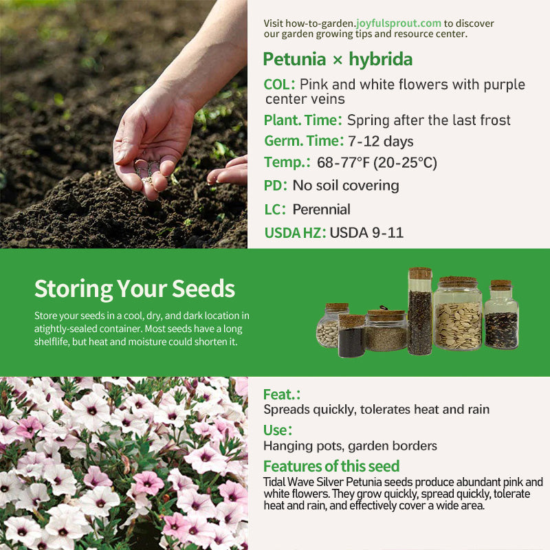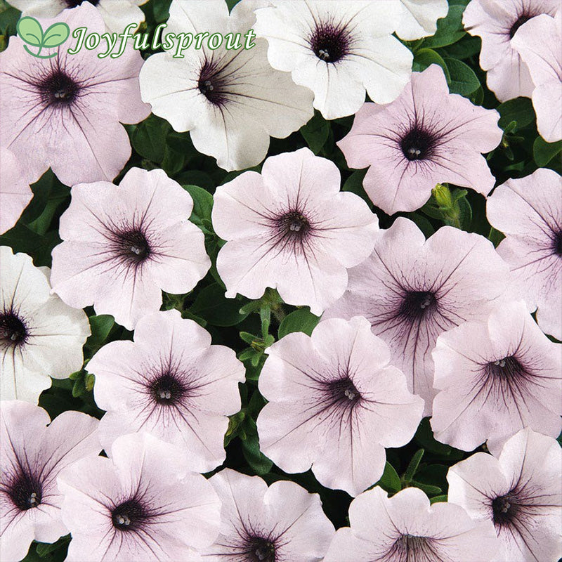 Plants grown from Tidal Wave Silver petunia seeds attract attention with their distinctive pink and white flowers. The numerous flowers, densely packed throughout the plant, create a unique silver-gray sea of blooms. Under sunlight or light, the flowers shimmer with a soft luster, creating a truly spectacular sight. The plant grows extremely quickly and has a strong spreading ability. Whether used in hanging baskets, hanging pots, or as a groundcover in flower beds, it can quickly cover a large area and create a vibrant landscape effect. The dark green, glossy leaves contrast sharply with the silver-gray flowers, further highlighting their uniqueness. Blooming continuously from spring to fall, provided adequate light and water are provided.