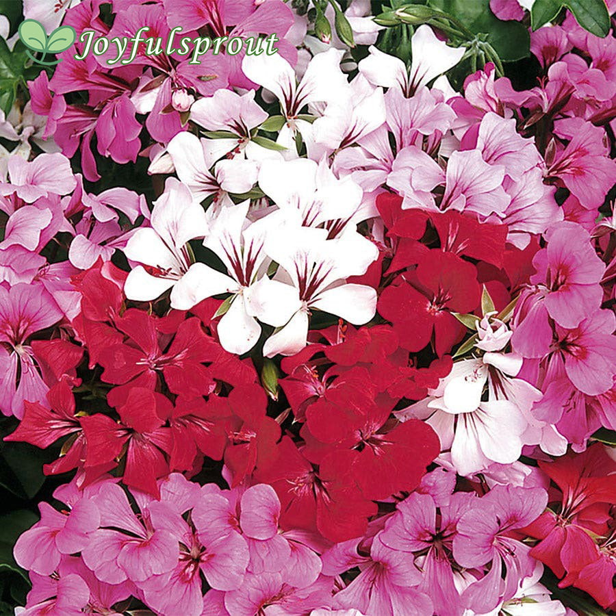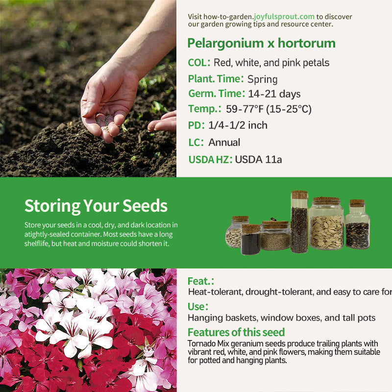 Tornado Mix geranium seeds produce trailing plants with vibrant, textured flowers in red, white, and pink. Although each flower is only about 2 inches in diameter, it blooms in large, loose clusters of 2-9 flowers, starting in early to late summer. The bright green, slightly fleshy leaves resemble English ivy and retain their shape well in high temperatures and humidity. This variety is drought-tolerant, heat-tolerant, and humidity-tolerant, making it easy to care for and suitable for hanging baskets, window boxes, and tall pots.