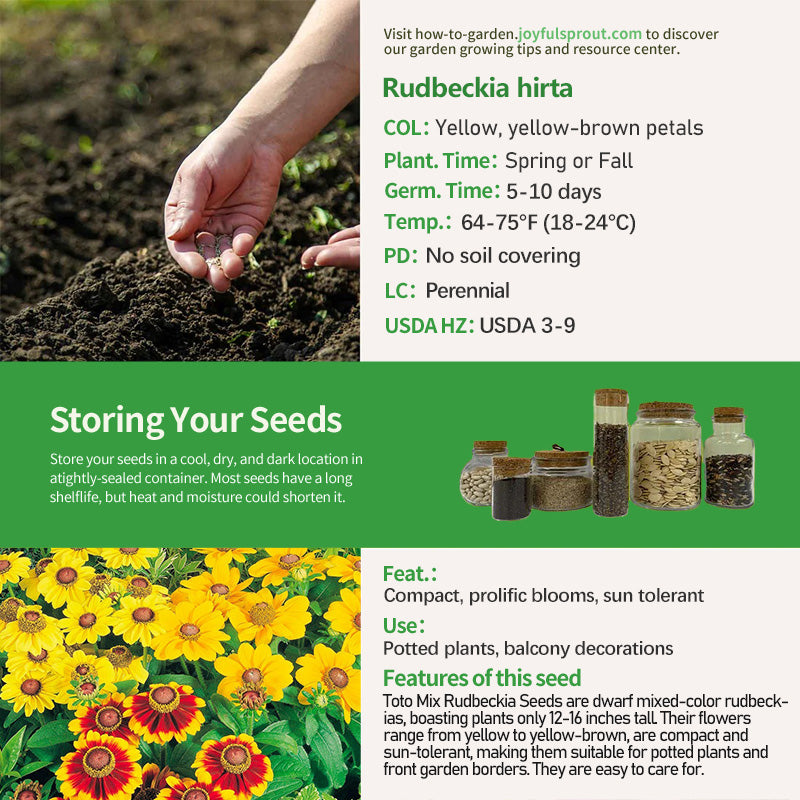Toto Mix Rudbeckia is a "dwarf star" among rudbeckias. Plants grown from seeds reach only 12-16 inches tall, with a compact, ball-shaped form that requires no pruning to maintain its shape, making it ideal for small spaces. The flowers range in warm hues like yellow and yellow-brown, and are approximately 2-3 inches in diameter. Although smaller than typical rudbeckias, they are abundant, with 15-20 blooms per plant, creating a "golden ball"-like appearance at peak bloom. The small, lanceolate, light green leaves grow closely around the stem, avoiding obstruction. Toto Mix Rudbeckia is sun- and drought-tolerant, blooming even in high-temperature balcony conditions. Its flowering period lasts from summer to autumn, making it highly adaptable and easy for even beginners to care for.Special Offers: