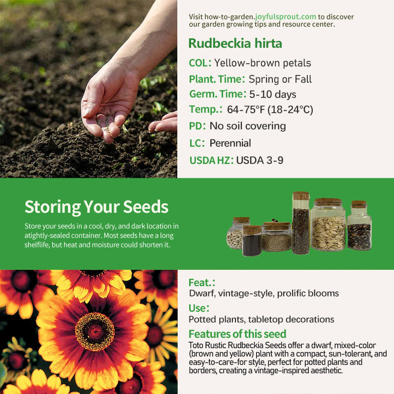 Toto Rustic Rudbeckia is a classic example of vintage style among rudbeckias. Plants grown from seed reach a height of only 10-14 inches, with a compact, spherical shape that requires no pruning to maintain its shape, making it ideal for small spaces. Its yellowish-brown flowers, resembling silk from bygone times, surround a dark center. Approximately 2-2.5 inches in diameter, they are compact yet strikingly elegant. The small, lanceolate, light green leaves grow closely around the stem, avoiding distracting attention from the flowers. It is sun- and drought-tolerant, blooming even in high-temperature balcony conditions. Its blooming period lasts from summer to autumn, making it easy to care for and even beginners can easily manage.