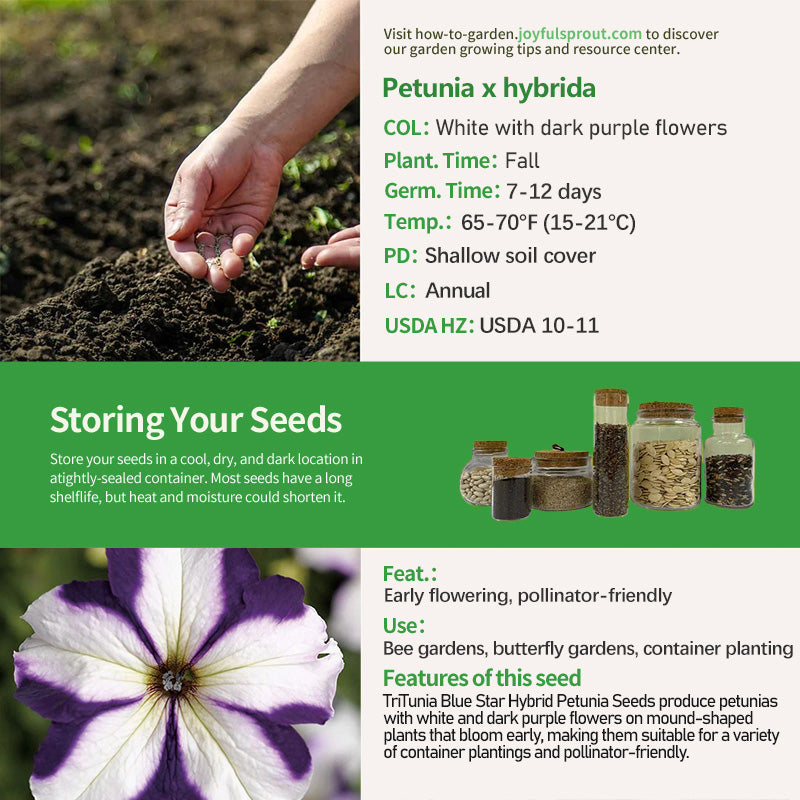 TriTunia Blue Star Hybrid Petunia Seeds produce attractive white and dark purple flowers. The mound-shaped plants reach a height of 10-12 inches and a width of 12-14 inches. As an annual, they bloom early, especially during the shorter daylight conditions of late winter and early spring. This pollinator-friendly variety is suitable for bee and butterfly gardens, as well as for container plantings and borders.