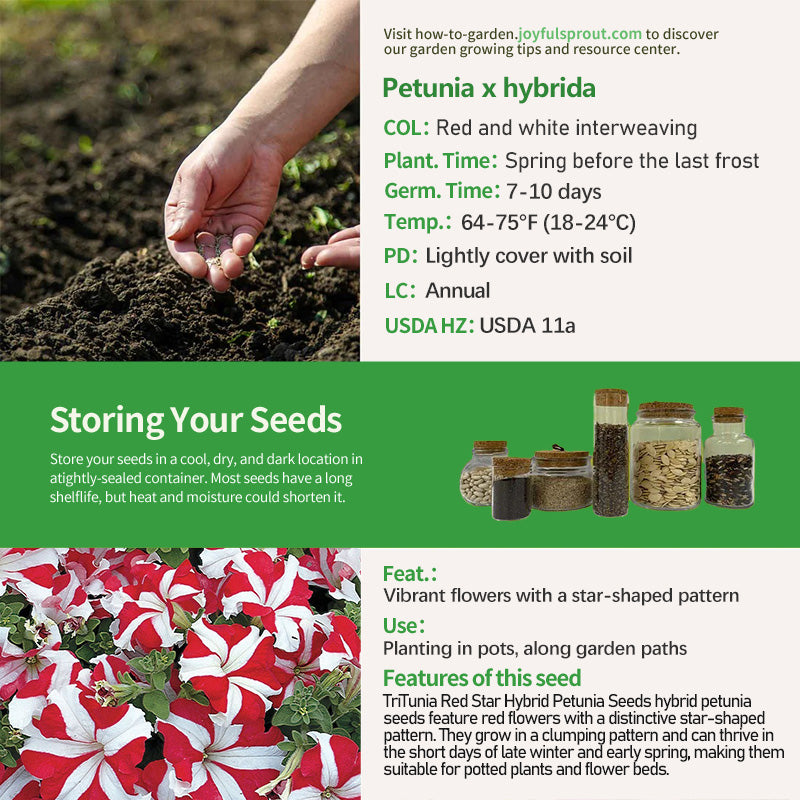 TriTunia Red Star Hybrid Petunia Seeds boasts striking red flowers with a distinctive star-shaped pattern on the petals, which stand out against the backdrop of green foliage. The plants grow in a clumping pattern, with a moderate height and width, typically around 10-12 inches. Their advantage lies in their low light requirements, allowing them to grow and bloom even in the short, low-light conditions of late winter and early spring. They are suitable for planting in various pots and look beautiful both indoors and outdoors. They can also be used in flower beds and combined with other flowers to create a vibrant and colorful landscape.