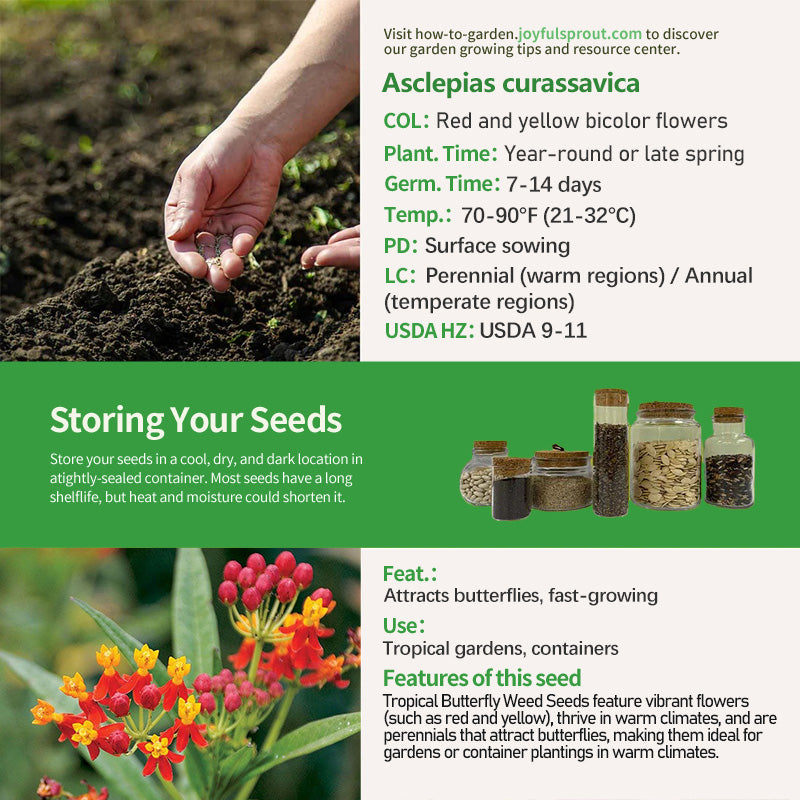 The tropical butterfly weed (Asclepias curassavica) to which these seeds correspond is a warm-climate perennial. Its vibrant flowers, often a combination of red and yellow, form drooping clusters of flowers with a unique shape, and bloom nearly year-round in warm regions. It prefers high temperatures and humidity and is intolerant of extreme cold, making it suitable for cultivation in USDA hardiness zones 9-11. The plant grows vigorously, reaching 2-3 feet in height, with lustrous emerald green leaves. As a key butterfly-attracting plant in tropical regions, it adds vitality to gardens, balconies, or container landscapes. It grows quickly and blooms shortly after sowing, making it ideal for landscapes seeking a quick effect.
