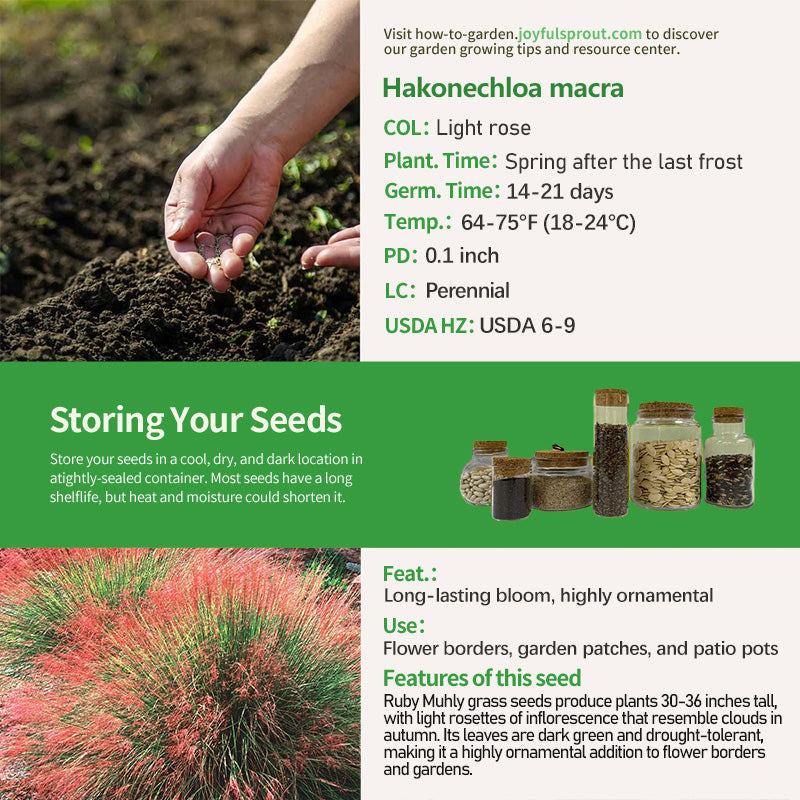 Ruby Muhly grass seeds produce plants that are the stars of autumn landscapes. They grow in clumps, reaching 30-36 inches tall. Their leaves are slender, linear, and soft, dark green. In summer, their dense foliage provides shade, creating a refreshing "grass curtain." In autumn (September-October), they produce panicles of rich light rose, 12-18 inches long. These inflorescences are fluffy and cloud-like, creating a striking visual effect when the breeze blows, resembling "clouds flowing across a green grass curtain." Individual plants can form clusters of flowers 1-2 feet in diameter. This variety is highly cold-tolerant, drought-tolerant, and poor-quality, and has low soil requirements. The inflorescences are more vibrant in full sun, and the flowering period lasts for approximately 1-2 months. Suitable for planting in patches in garden corners and flower borders, creating a vibrant sea of flowers.