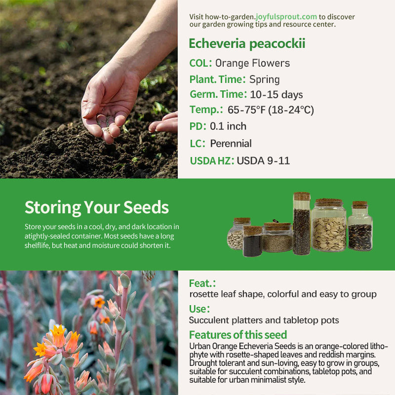 Urban Orange Echeveria Seeds are a favorite among succulent lovers. Cultivated plants with standard rosette arrangement of leaves, leaf color is a fresh orange tone, leaf margins will be haloed with deep red edges when there is enough light, layered and thick texture. The plant is drought-tolerant and sun-loving, with adequate summer shade, and is prone to sprouting side shoots from the base to form clusters. Compact, only 3-5 inches in height, suitable for combination with other succulent varieties to form a platter, or planted alone in miniature pots, placed in the desk, window sill, suitable for urban minimalist home style, without the need for careful care, can maintain full shape, ornamental lasting.
