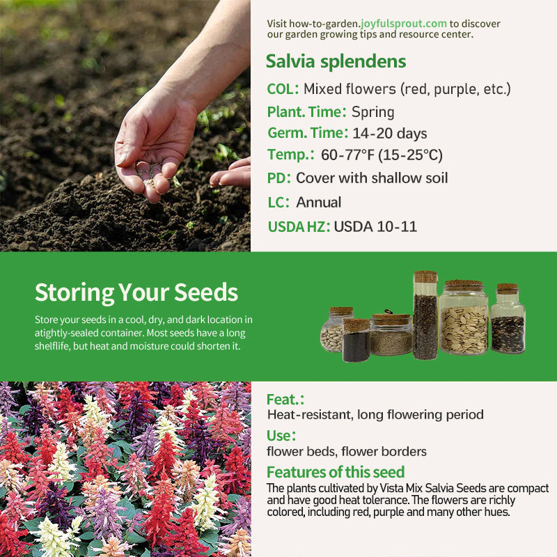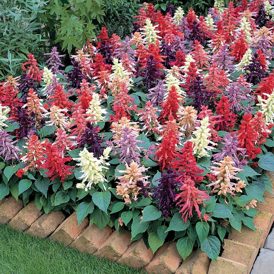 Hotline Improved Mix Salvia Seeds are annual seeds that produce compact, well-formed plants. The plants have bright green foliage, and at the top of the stem, the 4- to 5-inch spikes of colorful flowers are arranged in an orderly fashion, ranging from reds to purples to greens. The flowers begin to bloom in late spring and continue to bloom through early winter, providing a long season of uninterrupted color in the garden or container planting area. The flowers are not only aesthetically pleasing, but also attract pollinators such as hummingbirds and butterflies.