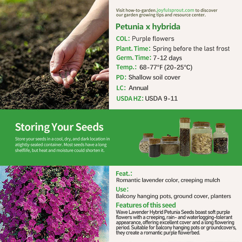 Wave Lavender Hybrid Petunia Seeds' core highlight is its soft purple flowers, a subtle, yet not overpowering, lavender-like romantic color. Its light, delicate petals wisply gracefully in the breeze, making them highly ornamental. The plant has a creeping growth pattern, with flexible, densely branched branches. It grows rapidly and can quickly cover pots, planters, or the ground after sowing, creating a dense "purple carpet." It is highly tolerant of rain and waterlogging, resisting flower and leaf rot after rain. It is also sun- and drought-tolerant and can grow in full sun or partial shade, blooming from late spring to late autumn, with new buds continuously emerging. Ideal for hanging pots on balconies, creating a "purple waterfall" of branches.