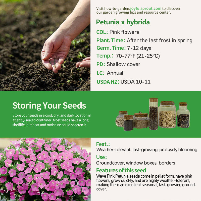 Wave Pink Petunia seeds produce fast-growing plants with pink flowers that reach 2.5 to 3 inches in diameter. The plants are highly weather-tolerant and can withstand heavy rain and even light frost. They make an excellent seasonal, fast-growing groundcover and are also well-suited for hanging baskets. From sowing to flowering, they take only 10 to 12 weeks and will continue to bloom until a severe frost.