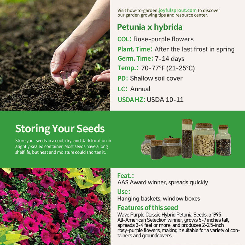 Wave Purple Classic Hybrid Petunia Seeds, a 1995 All-American Selection (AAS) winner, grows 5-7 inches tall yet boasts a strong spread, easily expanding to 3-4 feet or more. Its large, rosy-purple flowers, 2-2.5 inches in diameter, are numerous and densely cover the plant. It grows quickly, from sowing to flowering in just 9-11 weeks. It is easy to care for and adapts well to both hot and cool conditions, with better resistance to gray mold than most petunia varieties. Whether used in hanging baskets, window boxes, large containers, or as a groundcover in sunny areas, this plant makes a stunning landscape statement.