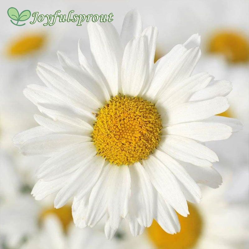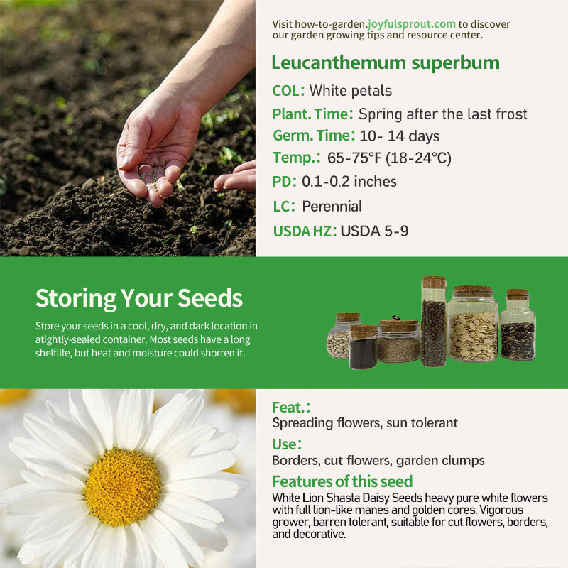 White Lion Shasta Daisy Seed-bred variety that stands out for its unique, heavy-petaled flower shape. The flowers are pure white with cascading petals wrapped tightly around a golden yellow core, resembling a lion's fluffy mane, and are full and three-dimensional, measuring about 3-4 inches in diameter. The plant is a vigorous, compact and well-organized plant with glossy green foliage that is far more ornamental than the common single-petaled chrysanthemum. It is highly adaptable, tolerating poor soils and summer heat, and blooms more profusely in full sun. It blooms from early summer to early fall and has a long vase life when cut as fresh cut flowers, keeping them fresh for a long time.