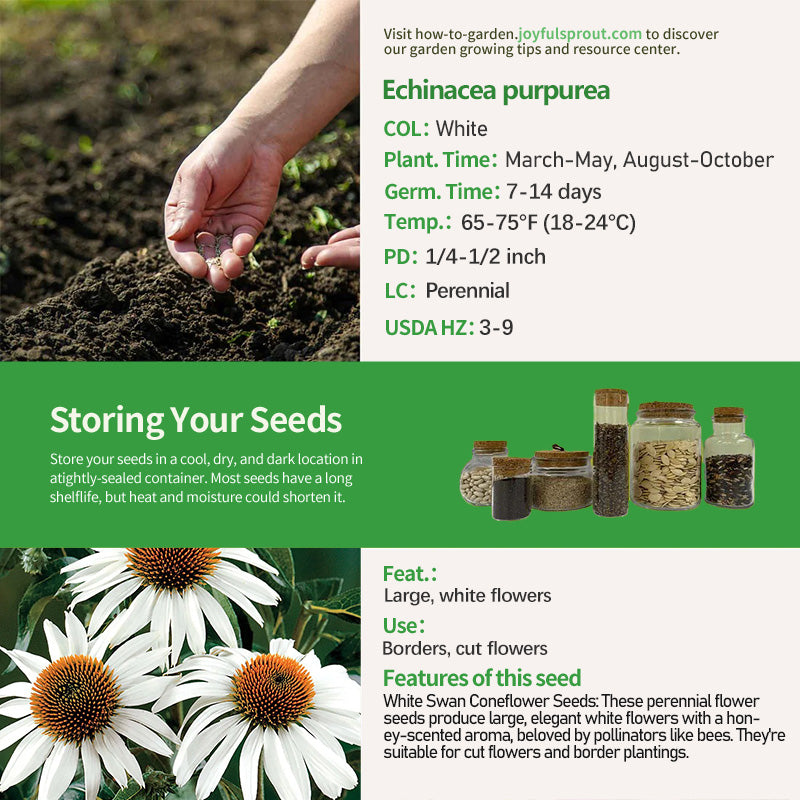 A florist had always dreamed of owning unique white flowers for his creations. He obtained White Swan Coneflower seeds. He planted the seeds in his garden and carefully tended them. The seeds germinated, and the plants flourished. When they bloomed, the large, snow-white flowers gracefully opened, exuding a delicate honey fragrance. Bees were drawn to the blossoms, and they bustled among them. The florist cut these beautiful flowers and used them in exquisite bouquets, where they became the centerpiece of his floral arrangements, all thanks to these magical White Swan Coneflower seeds.
